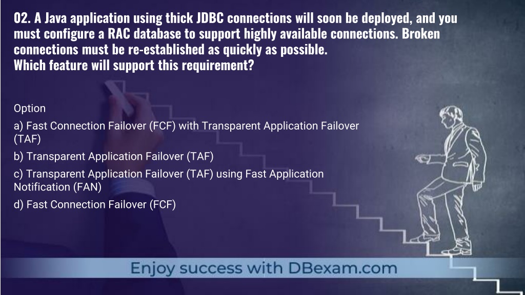02. A Java application using thick JDBC connections will soon be deployed, and you must configure a RAC database to support highly available connections. Broken connections must be re-established as quickly as possible. Which feature will support this requirement? Option a) Fast Connection Failover (FCF) with Transparent Application Failover (TAF) b) Transparent Application Failover (TAF) c) Transparent Application Failover (TAF) using Fast Application Notification (FAN) d) Fast Connection Failover (FCF)