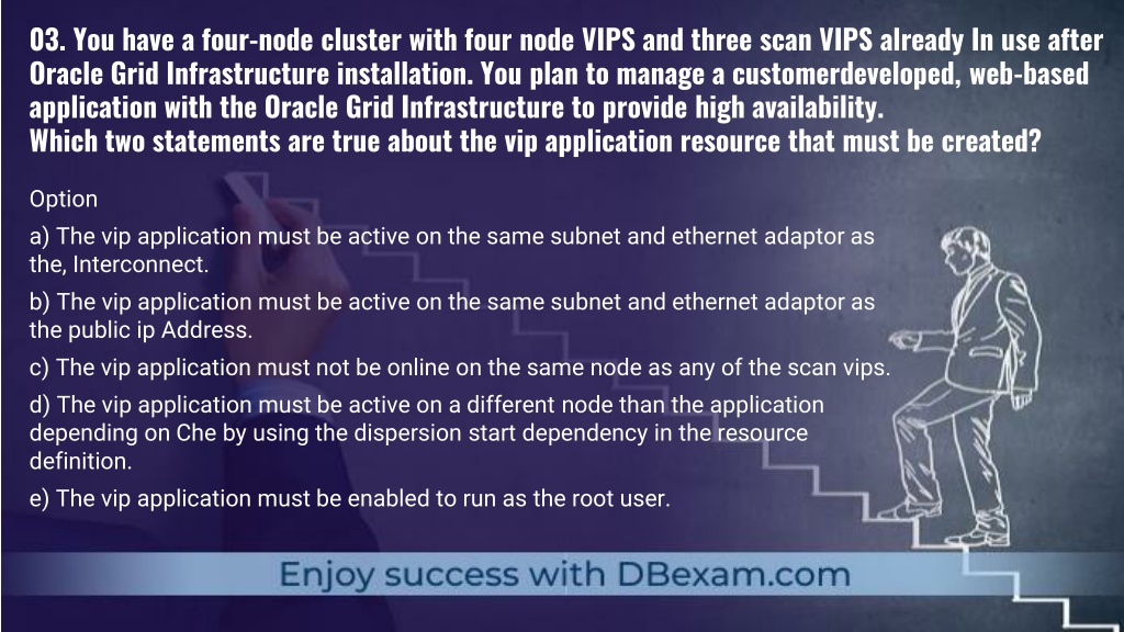 03. You have a four-node cluster with four node VIPS and three scan VIPS already In use after Oracle Grid Infrastructure installation. You plan to manage a customerdeveloped, web-based application with the Oracle Grid Infrastructure to provide high availability. Which two statements are true about the vip application resource that must be created? Option a) The vip application must be active on the same subnet and ethernet adaptor as the, Interconnect. b) The vip application must be active on the same subnet and ethernet adaptor as the public ip Address. c) The vip application must not be online on the same node as any of the scan vips. d) The vip application must be active on a different node than the application depending on Che by using the dispersion start dependency in the resource definition. e) The vip application must be enabled to run as the root user.