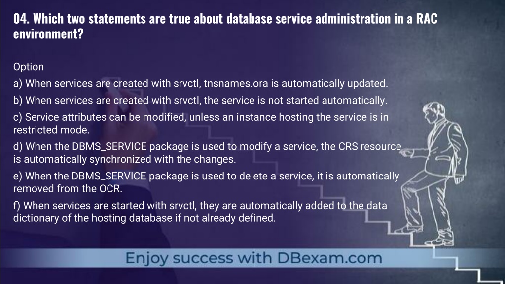 04. Which two statements are true about database service administration in a RAC environment? Option a) When services are created with srvctl, tnsnames.ora is automatically updated. b) When services are created with srvctl, the service is not started automatically. c) Service attributes can be modified, unless an instance hosting the service is in restricted mode. d) When the DBMS_SERVICE package is used to modify a service, the CRS resource is automatically synchronized with the changes. e) When the DBMS_SERVICE package is used to delete a service, it is automatically removed from the OCR. f) When services are started with srvctl, they are automatically added to the data dictionary of the hosting database if not already defined.
