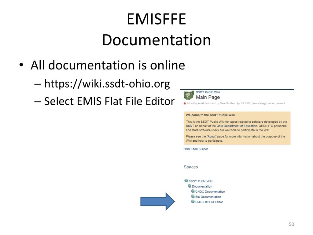 EMISFFE Documentation • All documentation is online • https://wiki.ssdt-ohio.org • Select EMIS Flat File Editor