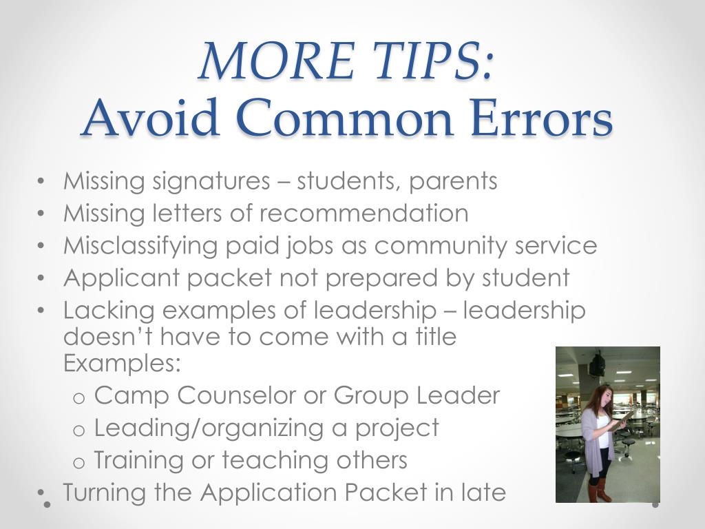 MORE TIPS:Avoid Common Errors • Missing signatures – students, parents • Missing letters of recommendation • Misclassifying paid jobs as community service • Applicant packet not prepared by student • Lacking examples of leadership – leadership doesn’t have to come with a titleExamples: • Camp Counselor or Group Leader • Leading/organizing a project • Training or teaching others • Turning the Application Packet in late