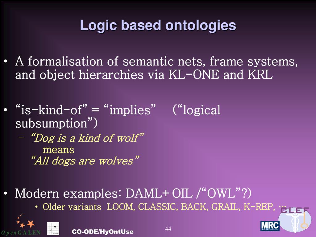 Logic based ontologies • A formalisation of semantic nets, frame systems, and object hierarchies via KL-ONE and KRL • “is-kind-of” = “implies” (“logical subsumption”) • “Dog is a kind of wolf” means“All dogs are wolves” • Modern examples: DAML+OIL /“OWL”?) • Older variants LOOM, CLASSIC, BACK, GRAIL, K-REP, …