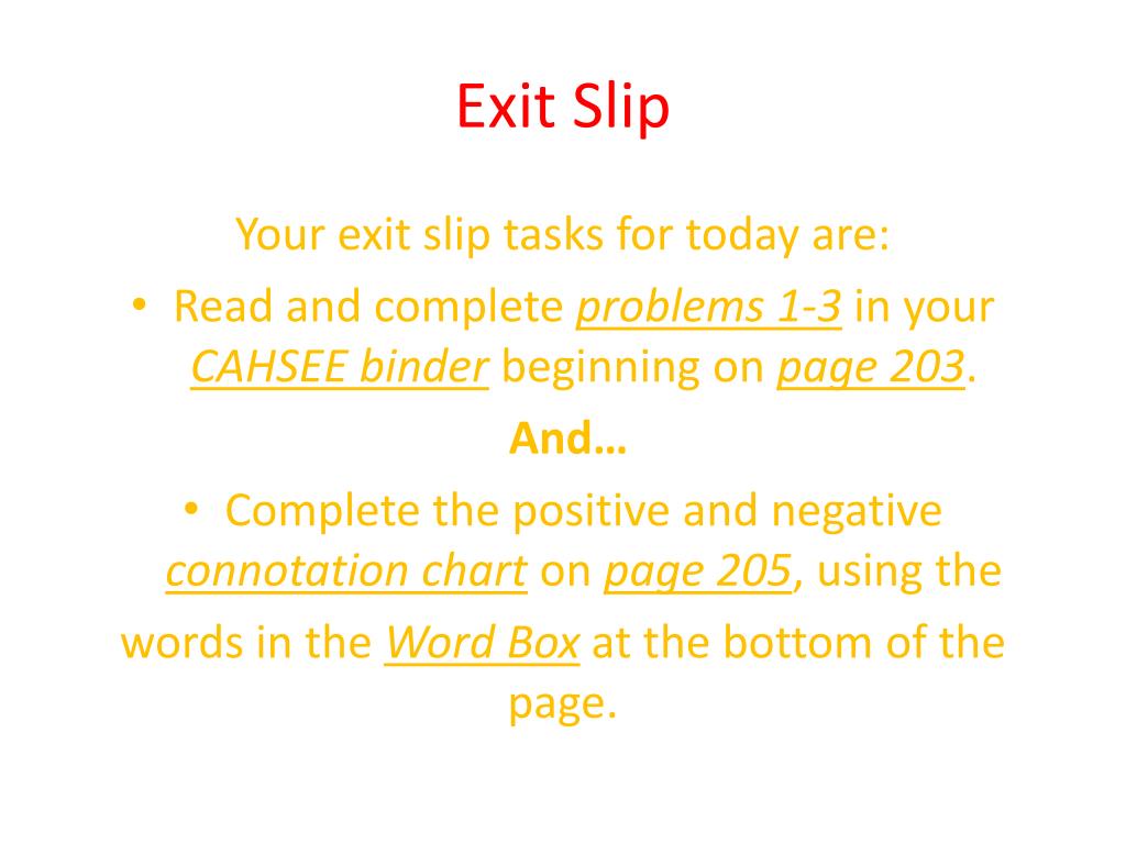 Exit Slip Your exit slip tasks for today are: • Read and complete problems 1-3 in your CAHSEE binder beginning on page 203. And… • Complete the positive and negative connotation chart on page 205, using the words in the Word Box at the bottom of the page.