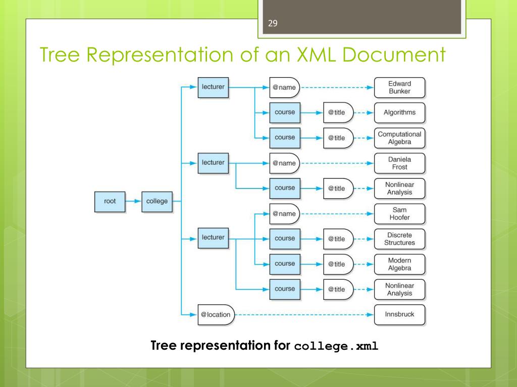 XML Example of a College <location name=Innsbruck> <college name= College of Engineering> <deptcode>CIS</deptcode> </college> </location> An XML document college.xml