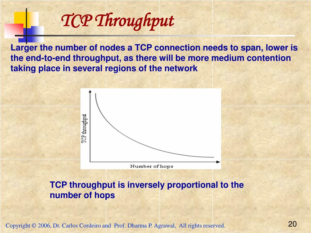 TCP Throughput Larger the number of nodes a TCP connection needs to span, lower is the end-to-end throughput, as there will be more medium contention taking place in several regions of the network TCP throughput is inversely proportional to the number of hops