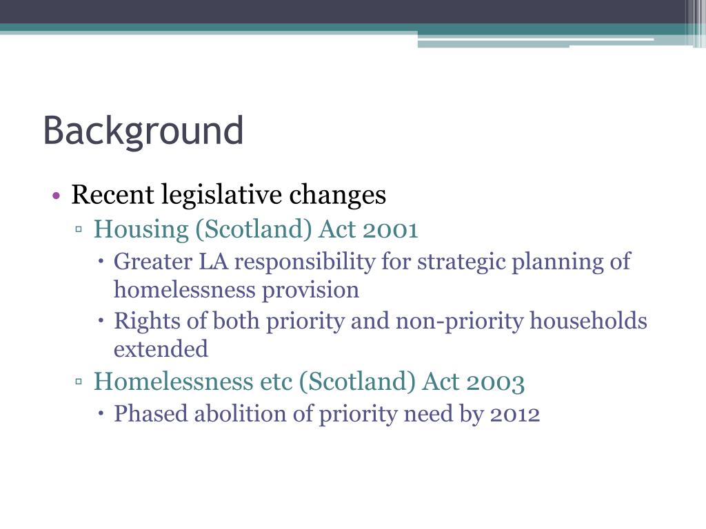 Background • Recent legislative changes • Housing (Scotland) Act 2001 • Greater LA responsibility for strategic planning of homelessness provision • Rights of both priority and non-priority households extended • Homelessness etc (Scotland) Act 2003 • Phased abolition of priority need by 2012