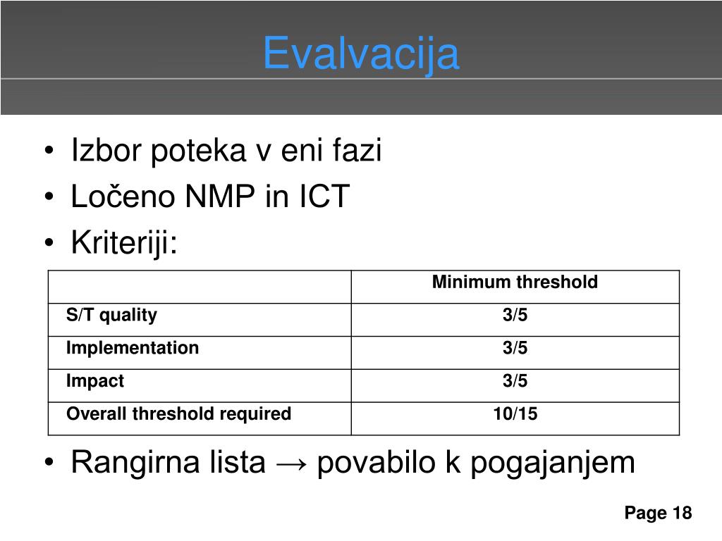 Evalvacija • Izbor poteka v eni fazi • Ločeno NMP in ICT • Kriteriji: • Rangirna lista → povabilo k pogajanjem