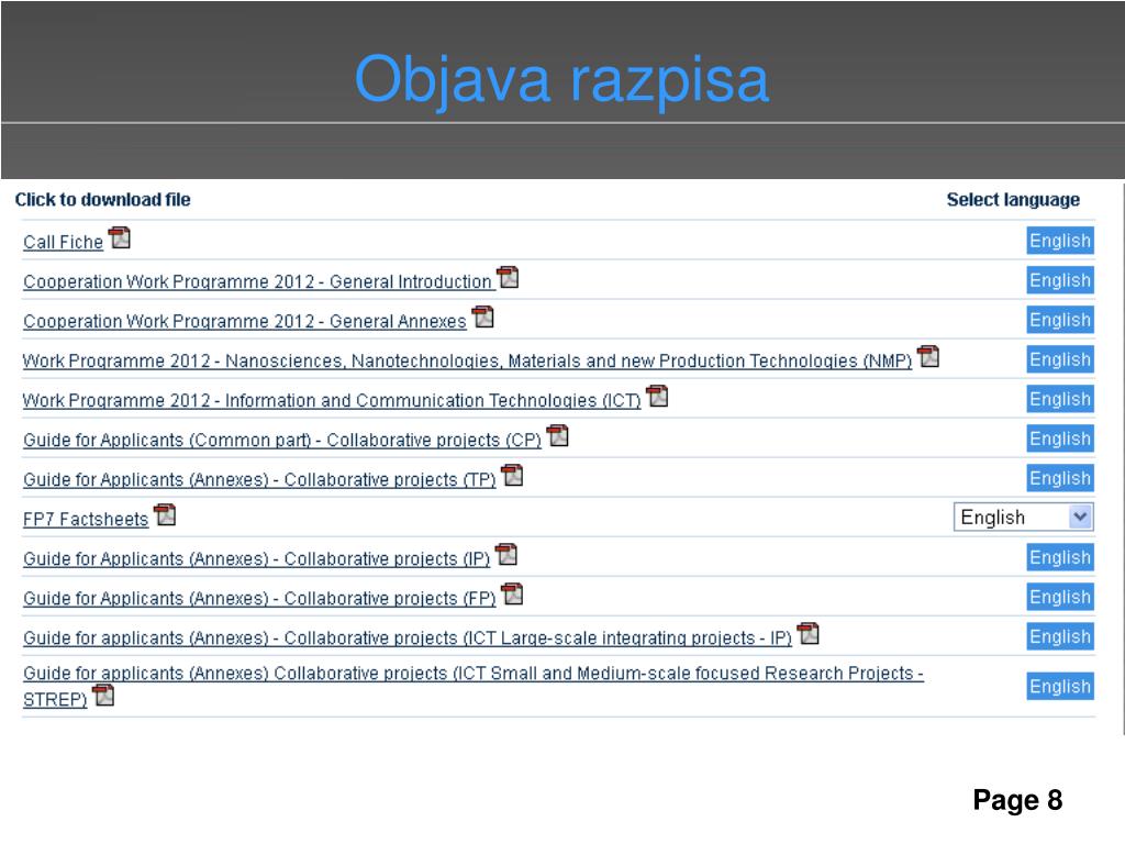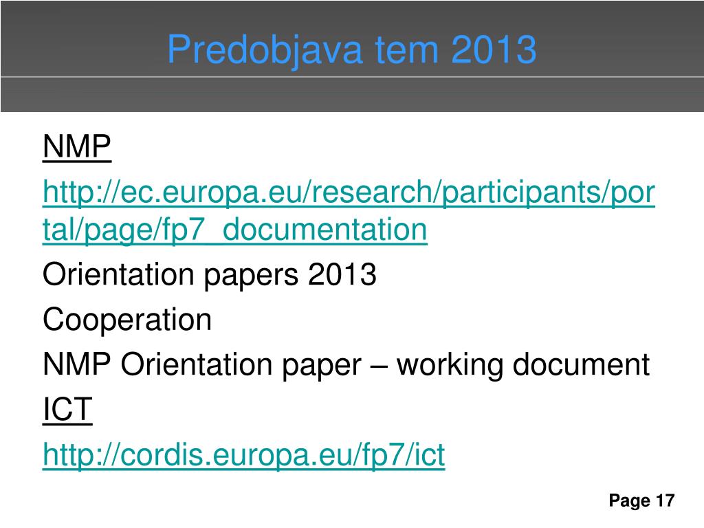 Predobjava tem 2013 NMP http://ec.europa.eu/research/participants/portal/page/fp7_documentation Orientation papers 2013 Cooperation NMP Orientation paper – working document ICT http://cordis.europa.eu/fp7/ict