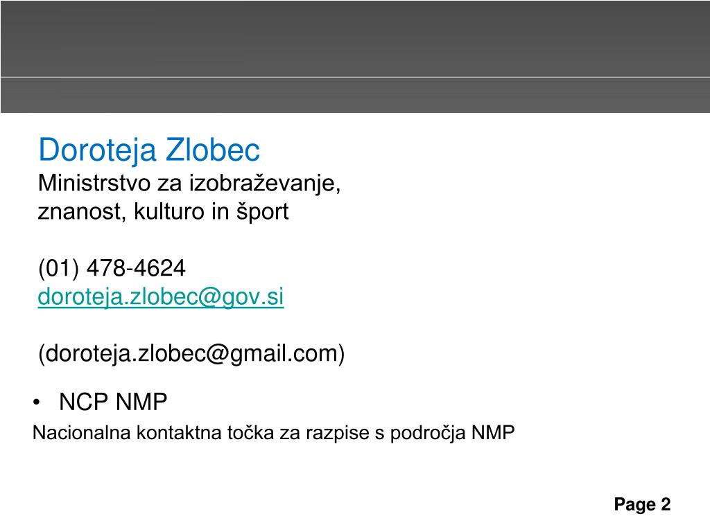 Doroteja ZlobecMinistrstvo za izobraževanje, znanost, kulturo in šport(01) 478-4624doroteja.zlobec@gov.si(doroteja.zlobec@gmail.com) • NCP NMP Nacionalna kontaktna točka za razpise s področja NMP