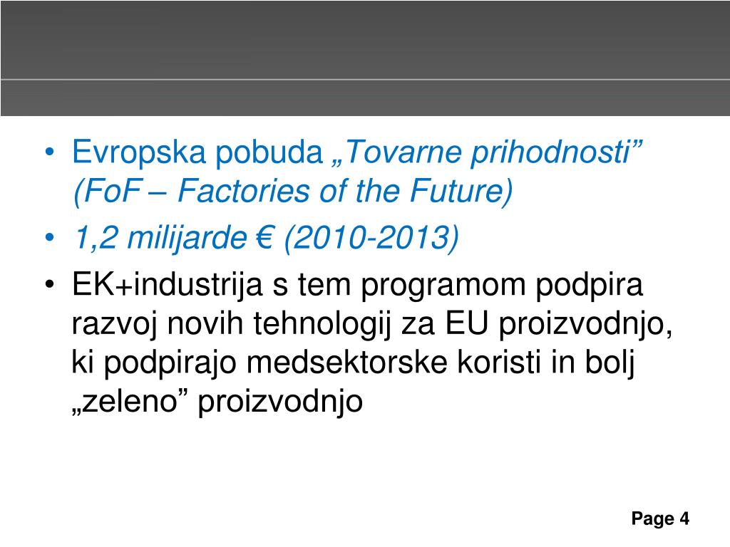 Evropska pobuda „Tovarne prihodnosti” (FoF – Factories of the Future) • 1,2 milijarde € (2010-2013) • EK+industrija s tem programom podpira razvoj novih tehnologij za EU proizvodnjo, ki podpirajo medsektorske koristi in bolj „zeleno” proizvodnjo