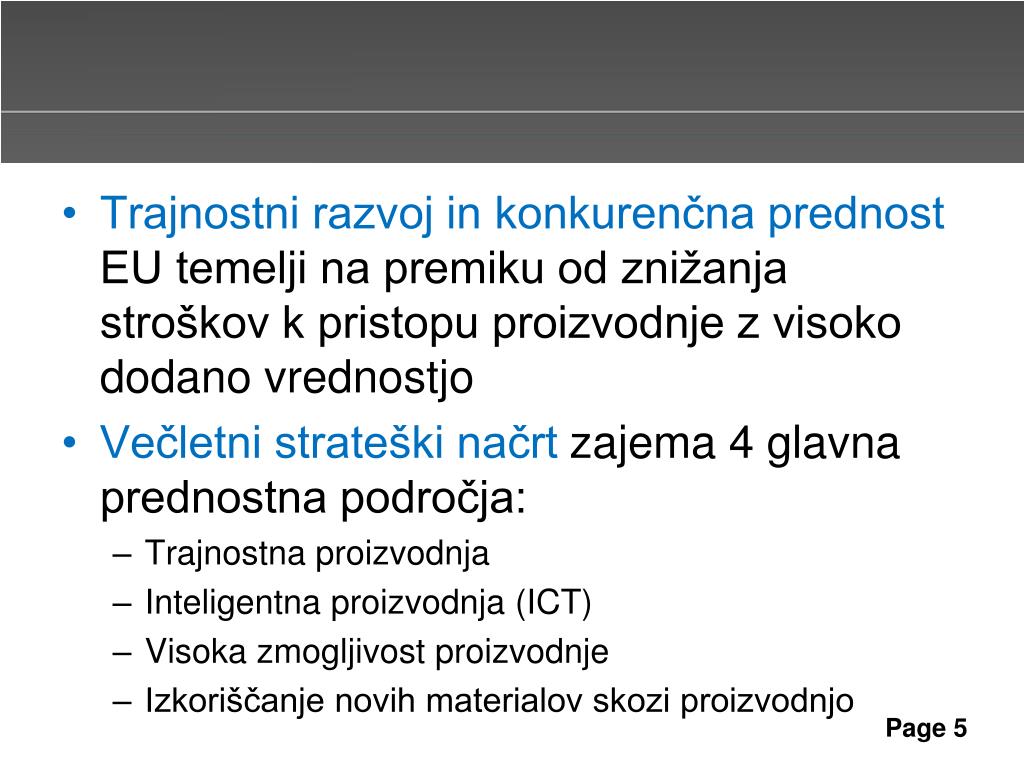 Trajnostni razvoj in konkurenčna prednost EU temelji na premiku od znižanja stroškov k pristopu proizvodnje z visoko dodano vrednostjo • Večletni strateški načrt zajema 4 glavna prednostna področja: • Trajnostna proizvodnja • Inteligentna proizvodnja (ICT) • Visoka zmogljivost proizvodnje • Izkoriščanje novih materialov skozi proizvodnjo