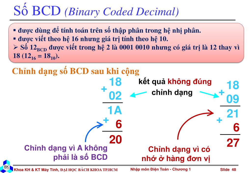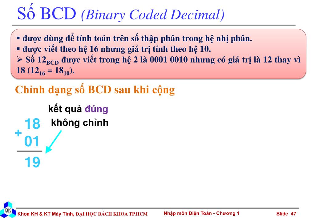 Số BCD (Binary Coded Decimal) • đượcdùngđểtínhtoántrênsốthậpphântronghệnhịphân. • đượcviếttheohệ 16 nhưnggiátrịtínhtheohệ 10. • Số 12BCDđượcviếttronghệ 2 là 0001 0010 nhưngcógiátrịlà 12 thayvì 18 (1216 = 1810). kếtquảkhôngđúng 18 09 chỉnhdạng Chỉnhdạngsố BCD saukhicộng + 18 02 + 21 6 + 1A 6 + 27 20 Chỉnhdạngvì A khôngphảilàsố BCD Chỉnhdạngvìcónhớ ở hàngđơnvị Nhập môn Điện Toán - Chương 1