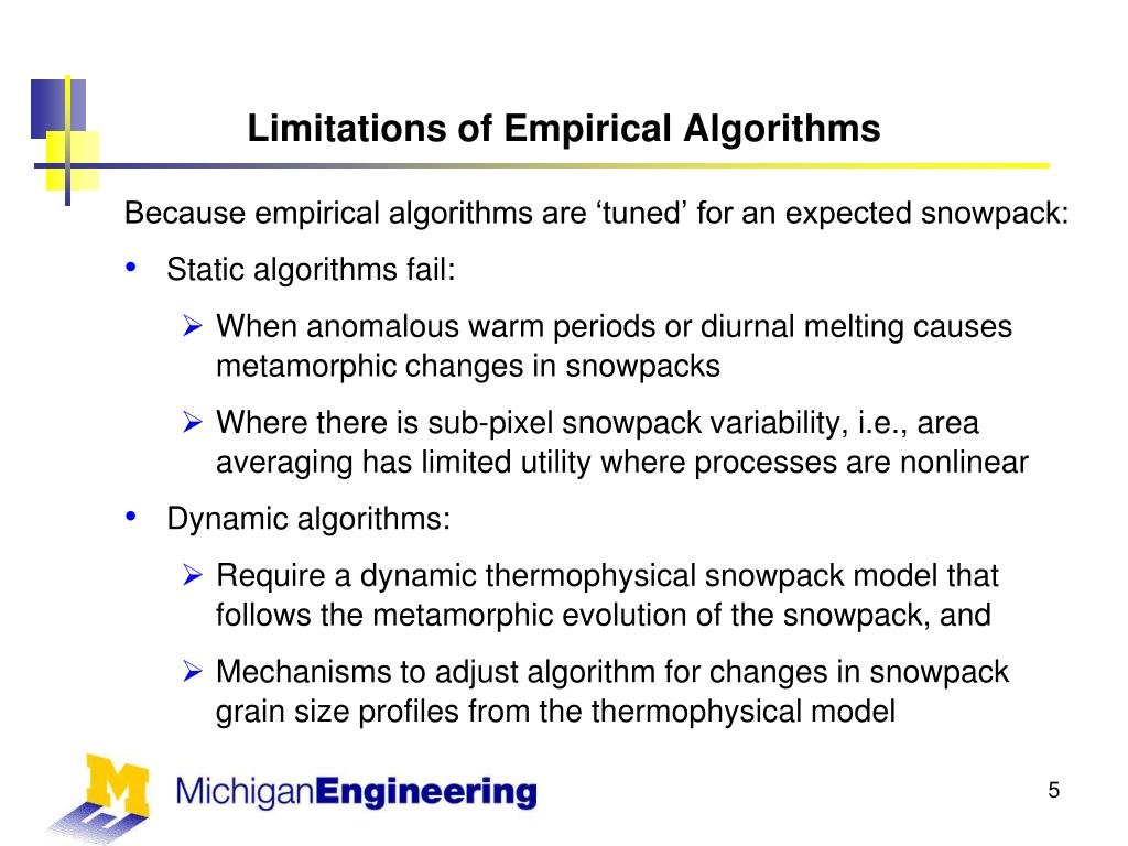 Limitations of Empirical Algorithms Because empirical algorithms are ‘tuned’ for an expected snowpack: • Static algorithms fail: • When anomalous warm periods or diurnal melting causes metamorphic changes in snowpacks • Where there is sub-pixel snowpack variability, i.e., area averaging has limited utility where processes are nonlinear • Dynamic algorithms: • Require a dynamic thermophysical snowpack model that follows the metamorphic evolution of the snowpack, and • Mechanisms to adjust algorithm for changes in snowpack grain size profiles from the thermophysical model
