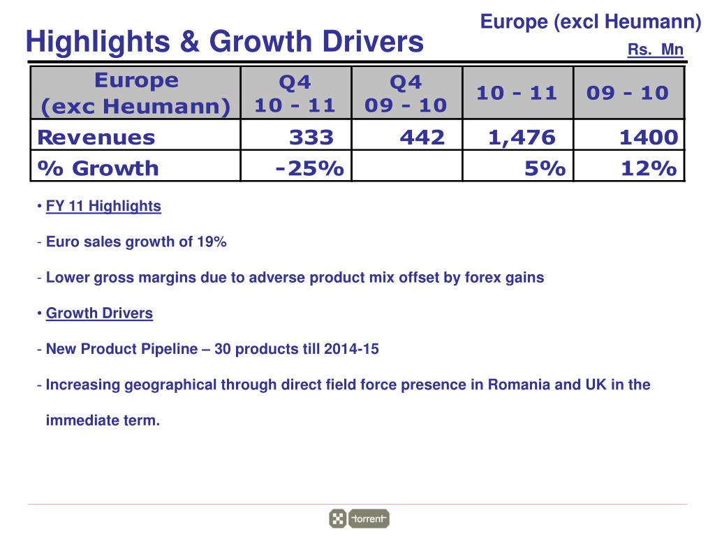Europe (excl Heumann) Highlights & Growth Drivers Rs. Mn • FY 11 Highlights • Euro sales growth of 19% • Lower gross margins due to adverse product mix offset by forex gains • Growth Drivers • New Product Pipeline – 30 products till 2014-15 • Increasing geographical through direct field force presence in Romania and UK in the immediate term.