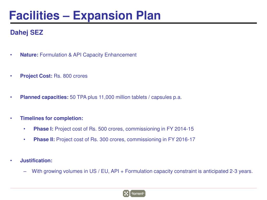 Facilities – Expansion Plan • Dahej SEZ • Nature: Formulation & API Capacity Enhancement • Project Cost: Rs. 800 crores • Planned capacities: 50 TPA plus 11,000 million tablets / capsules p.a. • Timelines for completion: • Phase I: Project cost of Rs. 500 crores, commissioning in FY 2014-15 • Phase II: Project cost of Rs. 300 crores, commissioning in FY 2016-17 • Justification: • With growing volumes in US / EU, API + Formulation capacity constraint is anticipated 2-3 years.