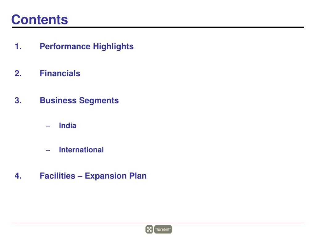 Contents • Performance Highlights • Financials • Business Segments • India • International • Facilities – Expansion Plan