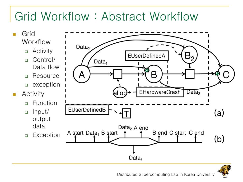 Grid Workflow : Abstract Workflow • Grid Workflow • Activity • Control/Data flow • Resource • exception • Activity • Function • Input/output data • Exception Data2 B2 EUserDefinedA Data1 A B C S S alloc Data3 EHardwareCrash EUserDefinedB (a) T Data2 A end A start B start B end C start C end Data1 (b) Data3 Distributed Supercomputing Lab in Korea University