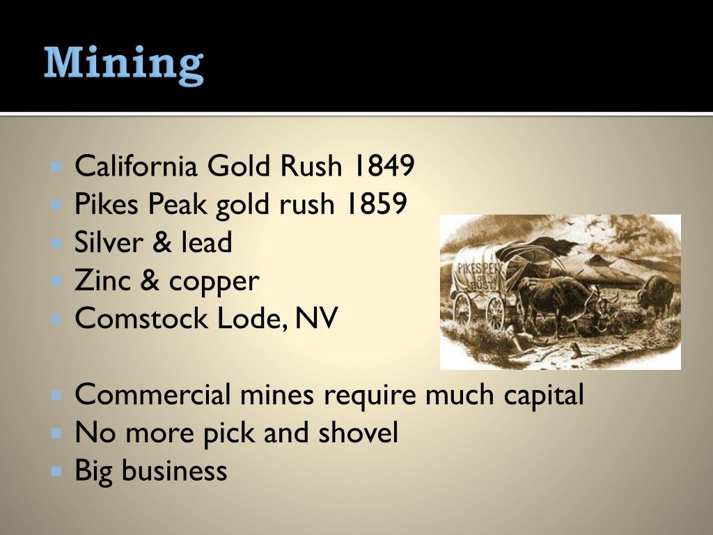 Mining • California Gold Rush 1849 • Pikes Peak gold rush 1859 • Silver & lead • Zinc & copper • Comstock Lode, NV • Commercial mines require much capital • No more pick and shovel • Big business
