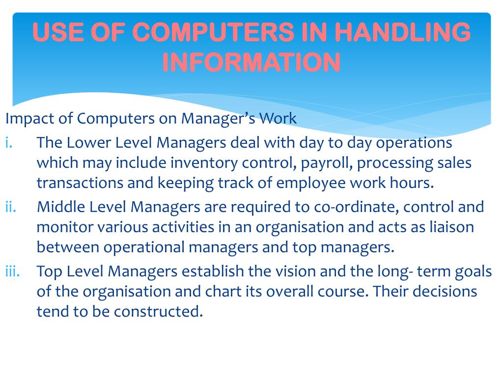 USE OF COMPUTERS IN HANDLING INFORMATION Impact of Computers on Manager’s Work The Lower Level Managers deal with day to day operations which may include inventory control, payroll, processing sales transactions and keeping track of employee work hours. Middle Level Managers are required to co-ordinate, control and monitor various activities in an organisation and acts as liaison between operational managers and top managers. Top Level Managers establish the vision and the long- term goals of the organisation and chart its overall course. Their decisions tend to be constructed.