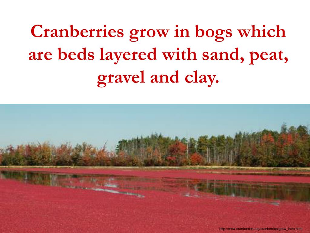 http://www.cranberries.org/cranberries/grow_intro.html Cranberries grow in bogs which are beds layered with sand, peat, gravel and clay.