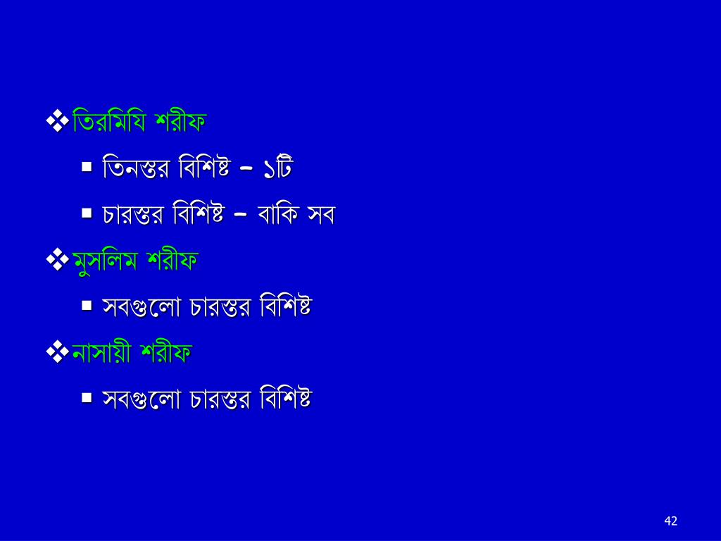 তিরমিযি শরীফ • তিনস্তর বিশিষ্ট – ১টি • চারস্তর বিশিষ্ট – বাকি সব • মুসলিম শরীফ • সবগুলো চারস্তর বিশিষ্ট • নাসায়ী শরীফ • সবগুলো চারস্তর বিশিষ্ট
