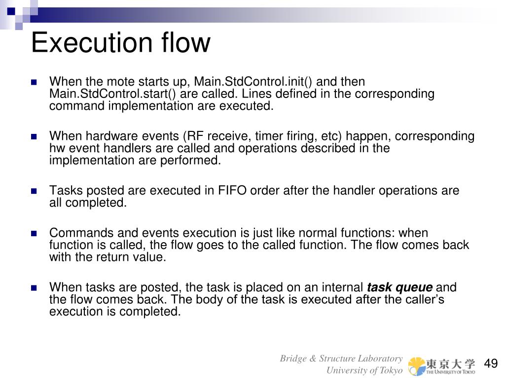 Execution flow • When the mote starts up, Main.StdControl.init() and then Main.StdControl.start() are called. Lines defined in the corresponding command implementation are executed. • When hardware events (RF receive, timer firing, etc) happen, corresponding hw event handlers are called and operations described in the implementation are performed. • Tasks posted are executed in FIFO order after the handler operations are all completed. • Commands and events execution is just like normal functions: when function is called, the flow goes to the called function. The flow comes back with the return value. • When tasks are posted, the task is placed on an internal task queue and the flow comes back. The body of the task is executed after the caller’s execution is completed.