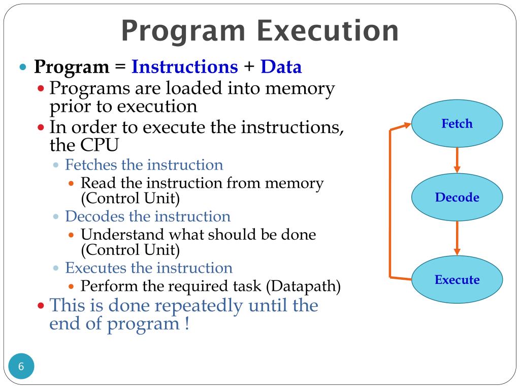 Program Execution • Program = Instructions + Data • Programs are loaded into memory prior to execution • In order to execute the instructions, the CPU • Fetches the instruction • Read the instruction from memory (Control Unit) • Decodes the instruction • Understand what should be done (Control Unit) • Executes the instruction • Perform the required task (Datapath) • This is done repeatedly until the end of program ! Fetch Decode Execute