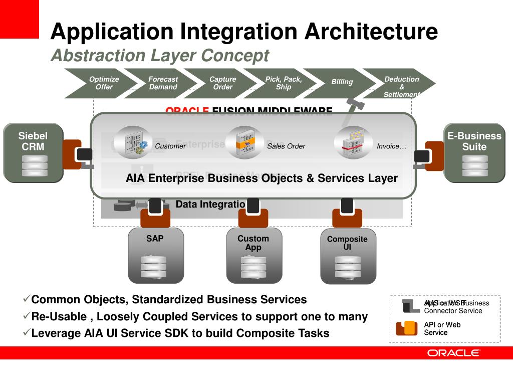 Application Integration ArchitectureAbstraction Layer Concept Optimize Offer Forecast Demand Capture Order Pick, Pack, Ship Deduction & Settlement Billing Siebel CRM E-Business Suite Enterprise Service Bus Customer Sales Order Invoice… BPEL Process Manager AIA Enterprise Business Objects & Services Layer Data Integration SAP Custom App Composite UI Application Business Connector Service JMS or WSIF API or Web Service API or Web Service • Common Objects, Standardized Business Services • Re-Usable , Loosely Coupled Services to support one to many • Leverage AIA UI Service SDK to build Composite Tasks