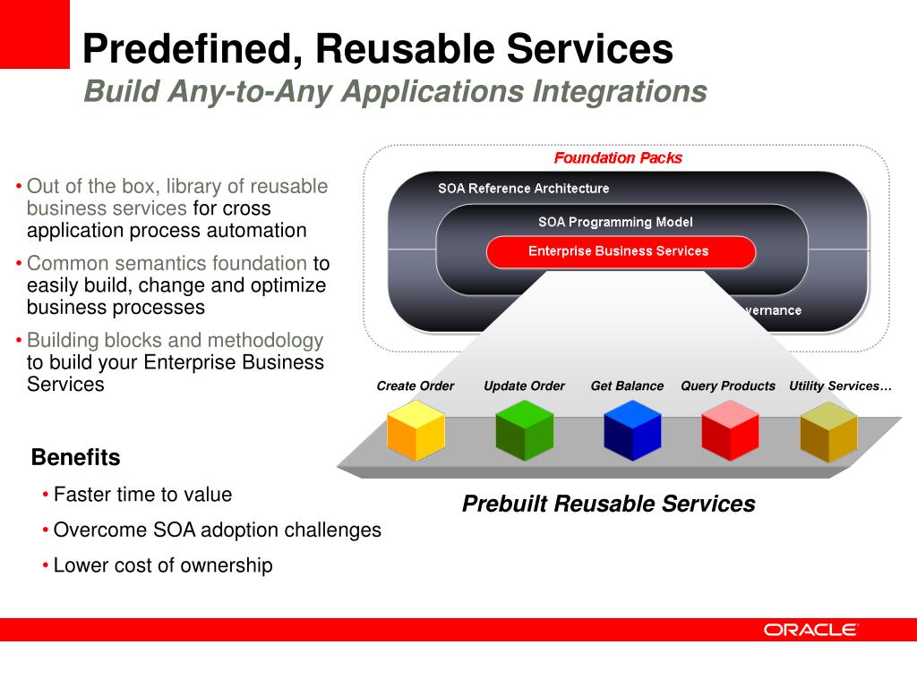 Predefined, Reusable ServicesBuild Any-to-Any Applications Integrations Out of the box, library of reusable business services for cross application process automation Common semantics foundation to easily build, change and optimize business processes Building blocksand methodology to build your Enterprise Business Services Create Order Update Order Get Balance Query Products Utility Services… Benefits • Faster time to value • Overcome SOA adoption challenges • Lower cost of ownership Prebuilt Reusable Services
