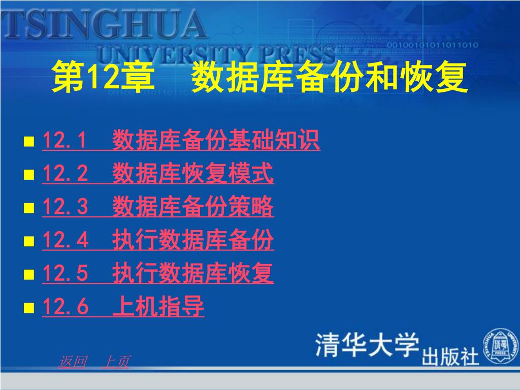 第12章 数据库备份和恢复 • 12.1 数据库备份基础知识 • 12.2 数据库恢复模式 • 12.3 数据库备份策略 • 12.4 执行数据库备份 • 12.5 执行数据库恢复 • 12.6 上机指导