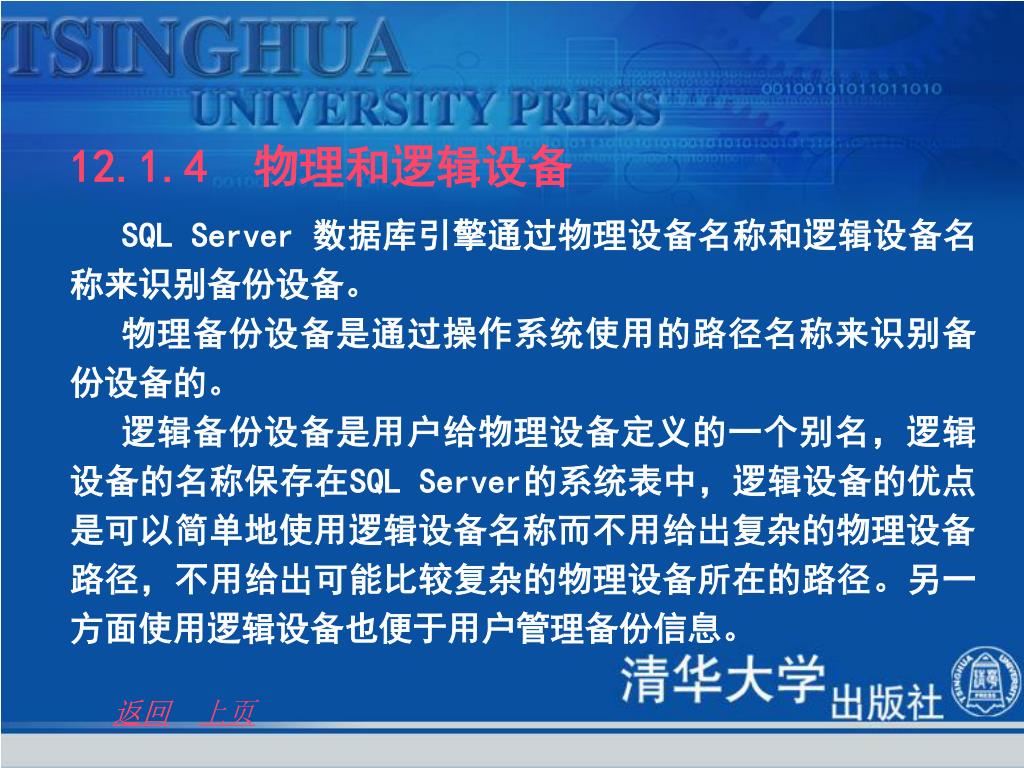 12.1.4 物理和逻辑设备 SQL Server 数据库引擎通过物理设备名称和逻辑设备名称来识别备份设备。 物理备份设备是通过操作系统使用的路径名称来识别备份设备的。 逻辑备份设备是用户给物理设备定义的一个别名,逻辑设备的名称保存在SQL Server的系统表中,逻辑设备的优点是可以简单地使用逻辑设备名称而不用给出复杂的物理设备路径,不用给出可能比较复杂的物理设备所在的路径。另一方面使用逻辑设备也便于用户管理备份信息。 返回