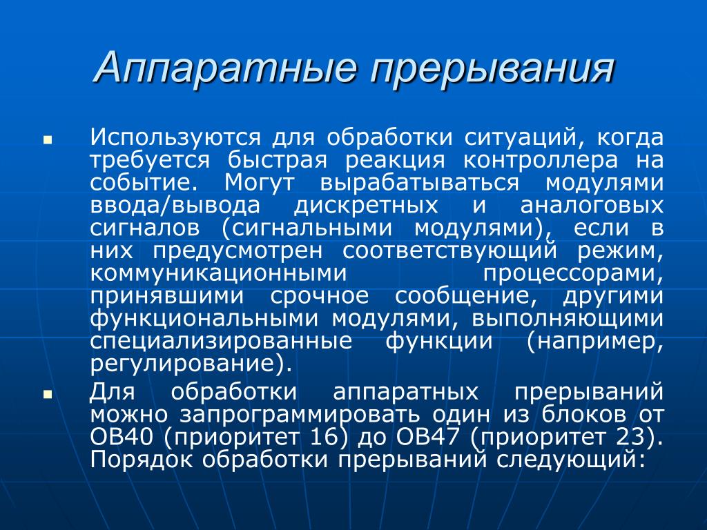 Аппаратные прерывания • Используются для обработки ситуаций, когда требуется быстрая реакция контроллера на событие. Могут вырабатываться модулями ввода/вывода дискретных и аналоговых сигналов (сигнальными модулями), если в них предусмотрен соответствующий режим, коммуникационными процессорами, принявшими срочное сообщение, другими функциональными модулями, выполняющими специализированные функции (например, регулирование). • Для обработки аппаратных прерываний можно запрограммировать один из блоков от OB40 (приоритет 16) до OB47 (приоритет 23). Порядок обработки прерываний следующий: