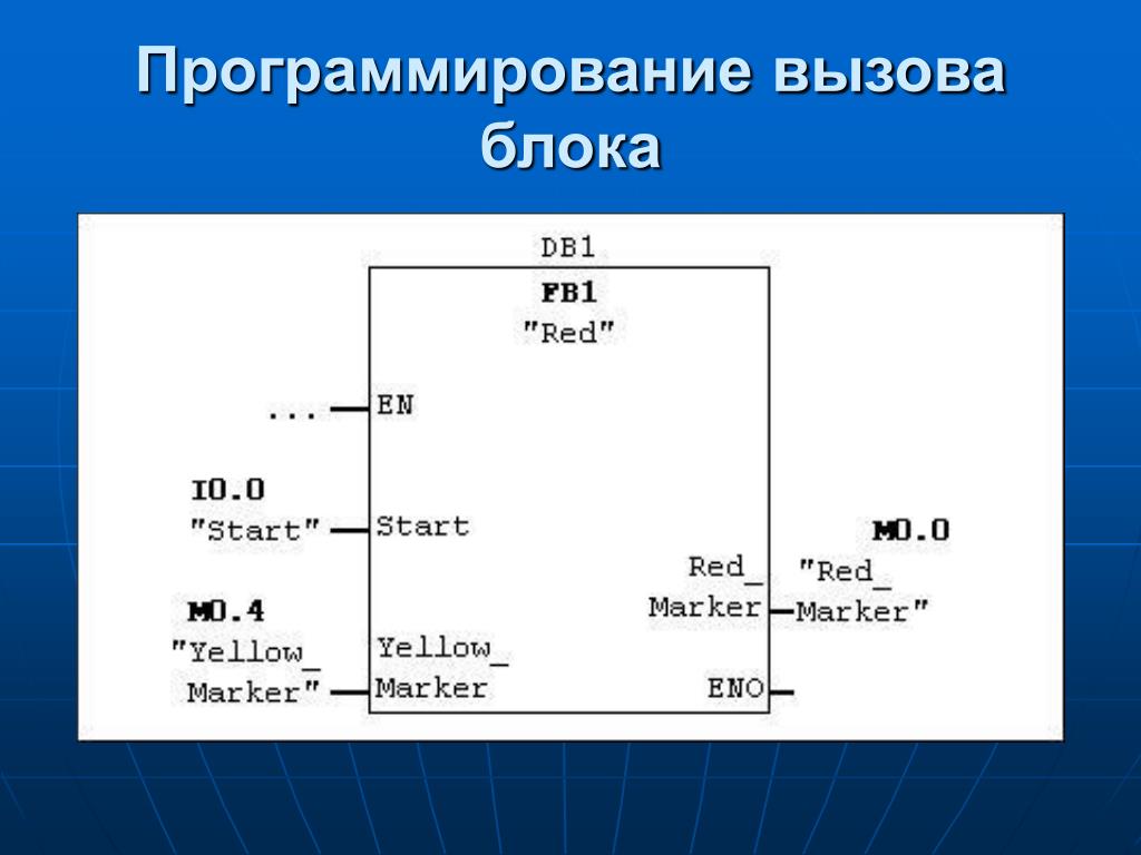 Программирование вызова блока • Создавая структуры программ с организационными блоками, функциональными блоками и блоками данных, необходимо программировать вызов для подчиненных блоков (таких, как FB1) в блоке, расположенном в иерархии более высоко (например, OB1). • Возможно также давать различным блокам символические имена в таблице символов (например, FB1 имеет имя "Engine [Двигатель]", а DB1 – имя "Petrol [Бензиновый]"). • При вставке в OB1 функционального блока необходимо указывать соответствующий ему блок данных и передавать/принимать фактические параметры блока.