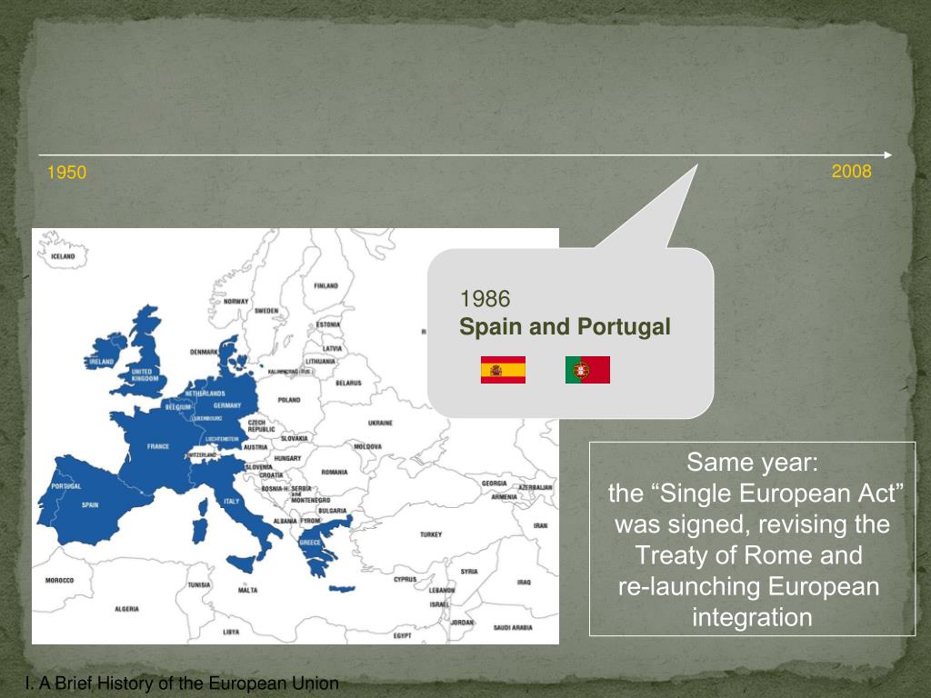 2008 1950 1986 Spain and Portugal Same year: the “Single European Act” was signed, revising the Treaty of Rome and re-launching European integration I. A Brief History of the European Union