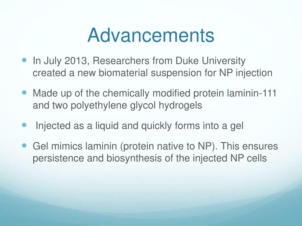 Advancements • In July 2013, Researchers from Duke University created a new biomaterial suspension for NP injection • Made up of the chemically modified protein laminin-111 and two polyethylene glycol hydrogels • Injected as a liquid and quickly forms into a gel • Gel mimics laminin (protein native to NP). This ensures persistence and biosynthesis of the injected NP cells