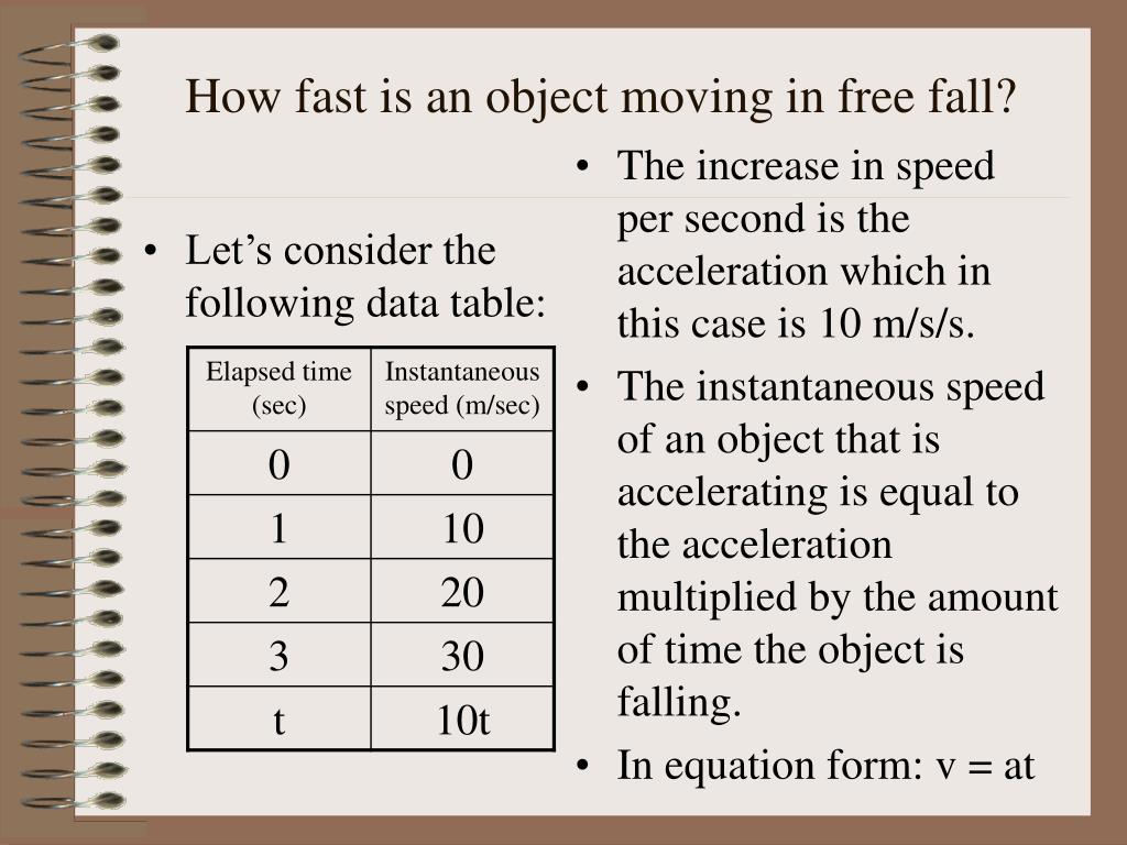 Let’s consider the following data table: The increase in speed per second is the acceleration which in this case is 10 m/s/s. The instantaneous speed of an object that is accelerating is equal to the acceleration multiplied by the amount of time the object is falling. In equation form: v = at How fast is an object moving in free fall?