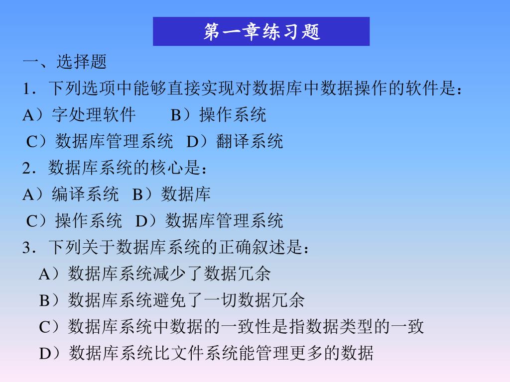 第一章练习题 一、选择题 1.下列选项中能够直接实现对数据库中数据操作的软件是: A)字处理软件 B)操作系统 C)数据库管理系统 D)翻译系统 2.数据库系统的核心是: A)编译系统 B)数据库 C)操作系统 D)数据库管理系统 3.下列关于数据库系统的正确叙述是: A)数据库系统减少了数据冗余 B)数据库系统避免了一切数据冗余 C)数据库系统中数据的一致性是指数据类型的一致 D)数据库系统比文件系统能管理更多的数据