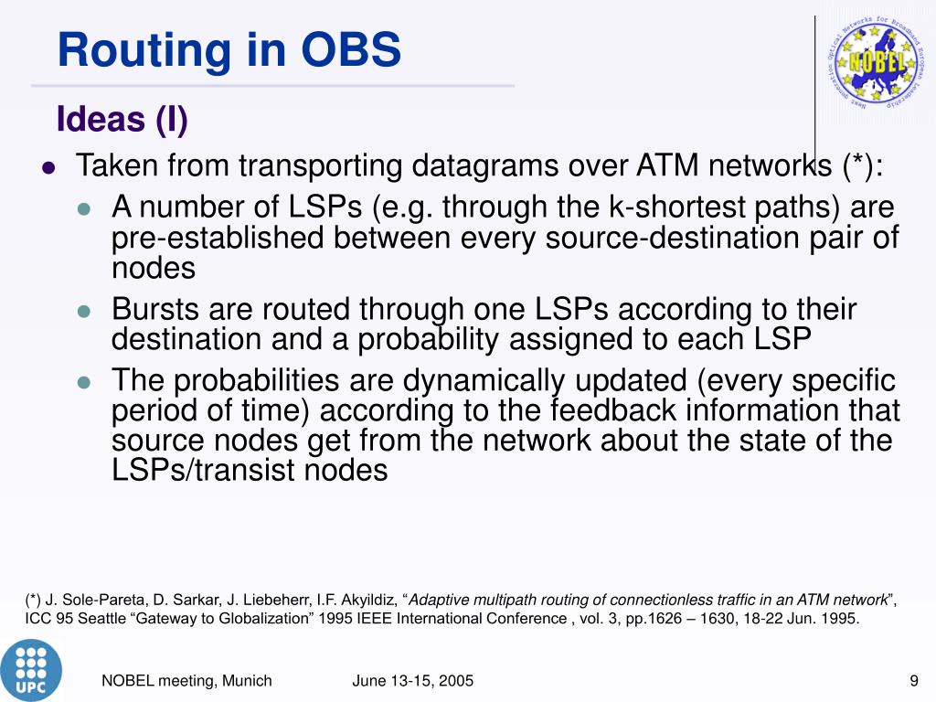 Routing in OBS Ideas (I) • Taken from transporting datagrams over ATM networks (*): • A number of LSPs (e.g. through the k-shortest paths) are pre-established between every source-destination pair of nodes • Bursts are routed through one LSPs according to their destination and a probability assigned to each LSP • The probabilities are dynamically updated (every specific period of time) according to the feedback information that source nodes get from the network about the state of the LSPs/transist nodes (*) J. Sole-Pareta, D. Sarkar, J. Liebeherr, I.F. Akyildiz, “Adaptive multipath routing of connectionless traffic in an ATM network”, ICC 95 Seattle “Gateway to Globalization” 1995 IEEE International Conference , vol. 3, pp.1626 – 1630, 18-22 Jun. 1995. NOBEL meeting, Munich