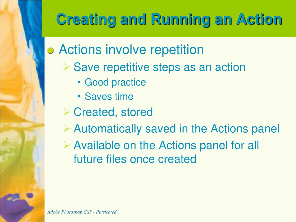 Creating and Running an Action • Actions involve repetition • Save repetitive steps as an action • Good practice • Saves time • Created, stored • Automatically saved in the Actions panel • Available on the Actions panel for all future files once created Adobe Photoshop CS5 - Illustrated