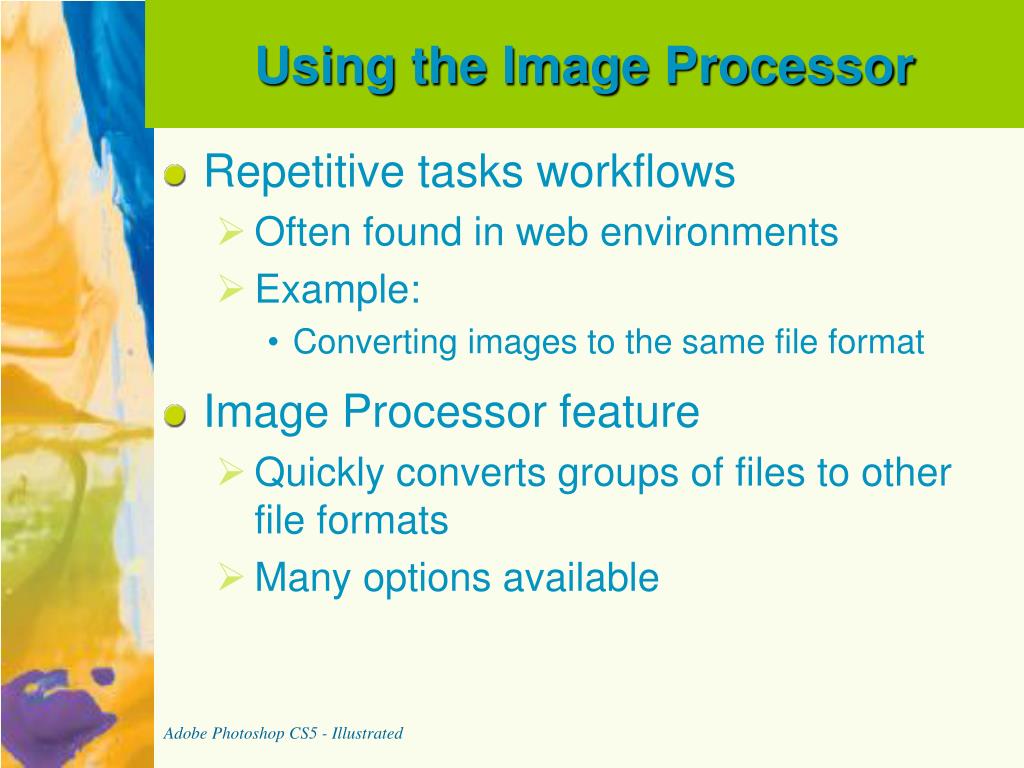 Using the Image Processor • Repetitive tasks workflows • Often found in web environments • Example: • Converting images to the same file format • Image Processor feature • Quickly converts groups of files to other file formats • Many options available Adobe Photoshop CS5 - Illustrated