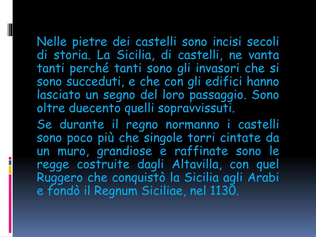 Nelle pietre dei castelli sono incisi secoli di storia. La Sicilia, di castelli, ne vanta tanti perché tanti sono gli invasori che si sono succeduti, e che con gli edifici hanno lasciato un segno del loro passaggio. Sono oltre duecento quelli sopravvissuti. Se durante il regno normanno i castelli sono poco più che singole torri cintate da un muro, grandiose e raffinate sono le regge costruite dagli Altavilla, con quel Ruggero che conquistò la Sicilia agli Arabi e fondò il RegnumSiciliae, nel 1130.