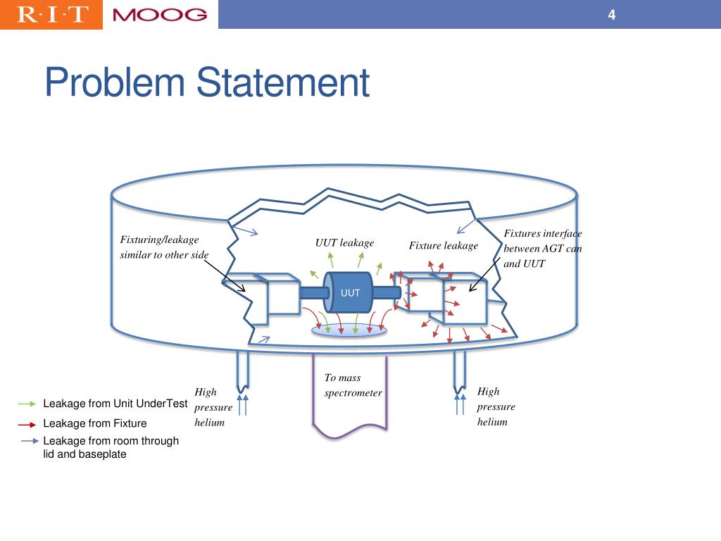 UUT Problem Statement Fixtures interface between AGT can and UUT Fixturing/leakage similar to other side UUT leakage Fixture leakage To mass spectrometer High pressure helium High pressure helium Leakage from Unit UnderTest Leakage from Fixture Leakage from room through lid and baseplate