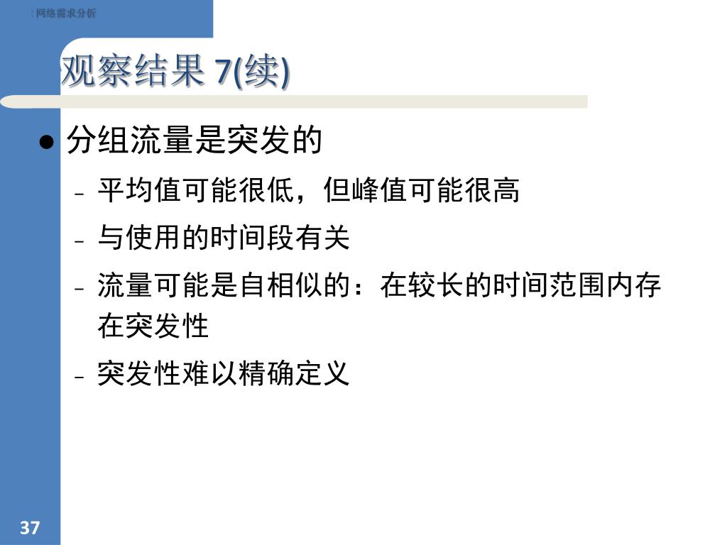 观察结果 7(续) • 分组流量是突发的 • 平均值可能很低,但峰值可能很高 • 与使用的时间段有关 • 流量可能是自相似的:在较长的时间范围内存在突发性 • 突发性难以精确定义