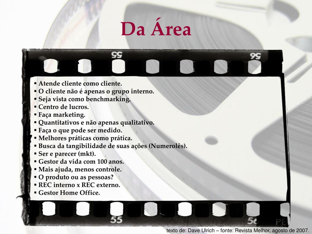Da Área • Atende cliente como cliente. • O cliente não é apenas o grupo interno. • Seja vista como benchmarking. • Centro de lucros. • Faça marketing. • Quantitativos e não apenas qualitativo. • Faça o que pode ser medido. • Melhores práticas como prática. • Busca da tangibilidade de suas ações (Numerolês). • Ser e parecer (mkt). • Gestor da vida com 100 anos. • Mais ajuda, menos controle. • O produto ou as pessoas? • REC interno x REC externo. • Gestor Home Office. texto de: Dave Ulrich – fonte: Revista Melhor, agosto de 2007.