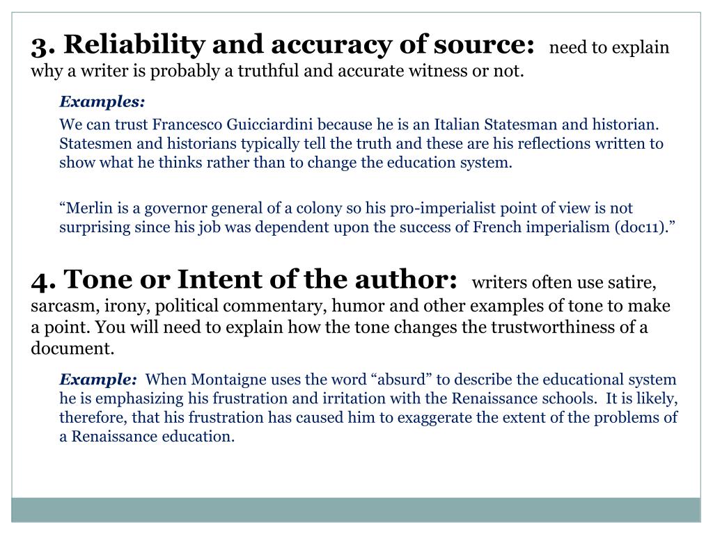 3. Reliability and accuracy of source: need to explain why a writer is probably a truthful and accurate witness or not. Examples: We can trust Francesco Guicciardini because he is an Italian Statesman and historian. Statesmen and historians typically tell the truth and these are his reflections written to show what he thinks rather than to change the education system. “Merlin is a governor general of a colony so his pro-imperialist point of view is not surprising since his job was dependent upon the success of French imperialism (doc11).” 4. Tone or Intent of the author: writers often use satire, sarcasm, irony, political commentary, humor and other examples of tone to make a point. You will need to explain how the tone changes the trustworthiness of a document. Example: When Montaigne uses the word “absurd” to describe the educational system he is emphasizing his frustration and irritation with the Renaissance schools. It is likely, therefore, that his frustration has caused him to exaggerate the extent of the problems of a Renaissance education.