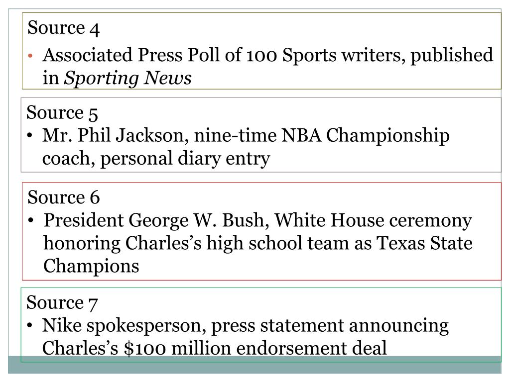 Source 5 • Mr. Phil Jackson, nine-time NBA Championship coach, personal diary entry • Source 6 • President George W. Bush, White House ceremony honoring Charles’s high school team as Texas State Champions • Source 7 • Nike spokesperson, press statement announcing Charles’s $100 million endorsement deal Source 4 • Associated Press Poll of 100 Sports writers, published in Sporting News