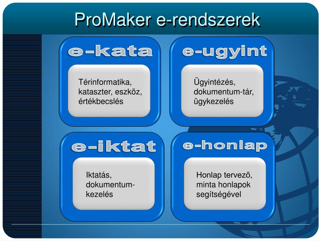 ProMaker e-rendszerek Térinformatika, kataszter, eszköz, értékbecslés Ügyintézés, dokumentum-tár, ügykezelés Iktatás, dokumentum- kezelés Honlap tervező, minta honlapok segítségével