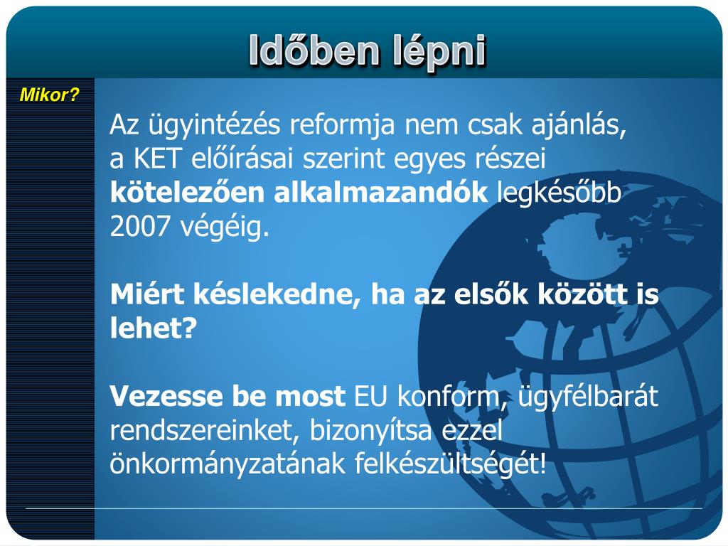 Mikor? Az ügyintézés reformja nem csak ajánlás,a KET előírásai szerint egyes részei kötelezően alkalmazandók legkésőbb 2007 végéig. Miért késlekedne, ha az elsők között is lehet? Vezesse be most EU konform, ügyfélbarát rendszereinket, bizonyítsa ezzel önkormányzatának felkészültségét!