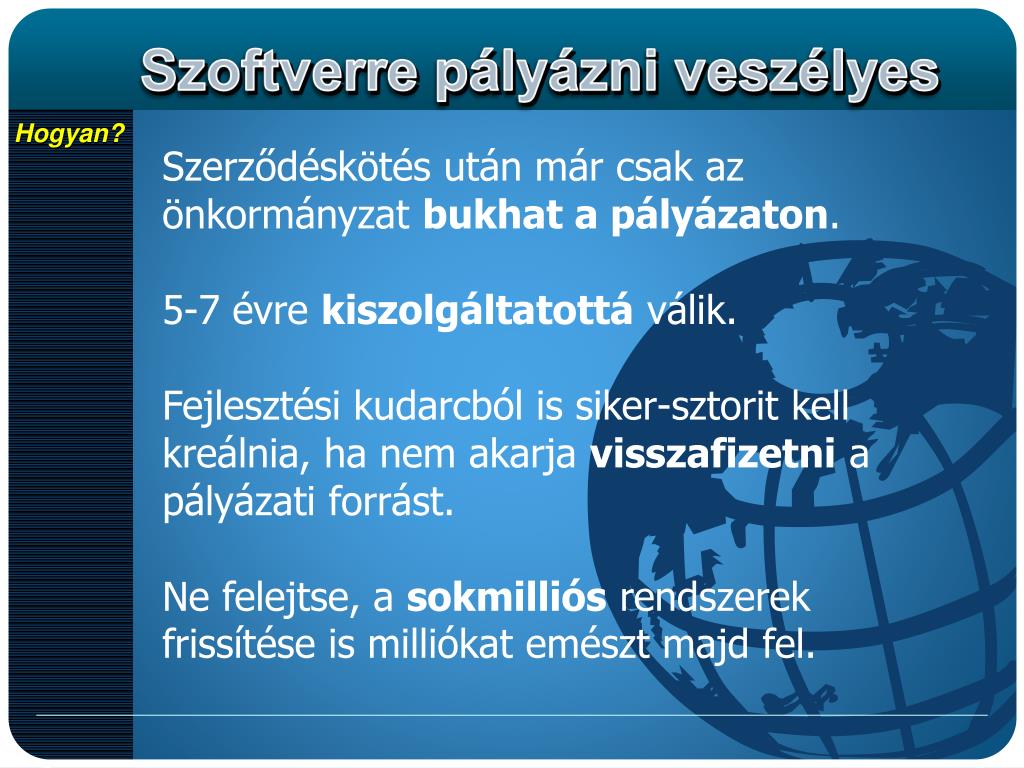 Hogyan? Szerződéskötés után már csak az önkormányzat bukhat a pályázaton. 5-7 évre kiszolgáltatottá válik. Fejlesztési kudarcból is siker-sztorit kell kreálnia, ha nem akarja visszafizetni a pályázati forrást. Ne felejtse, a sokmilliós rendszerek frissítése is milliókat emészt majd fel.