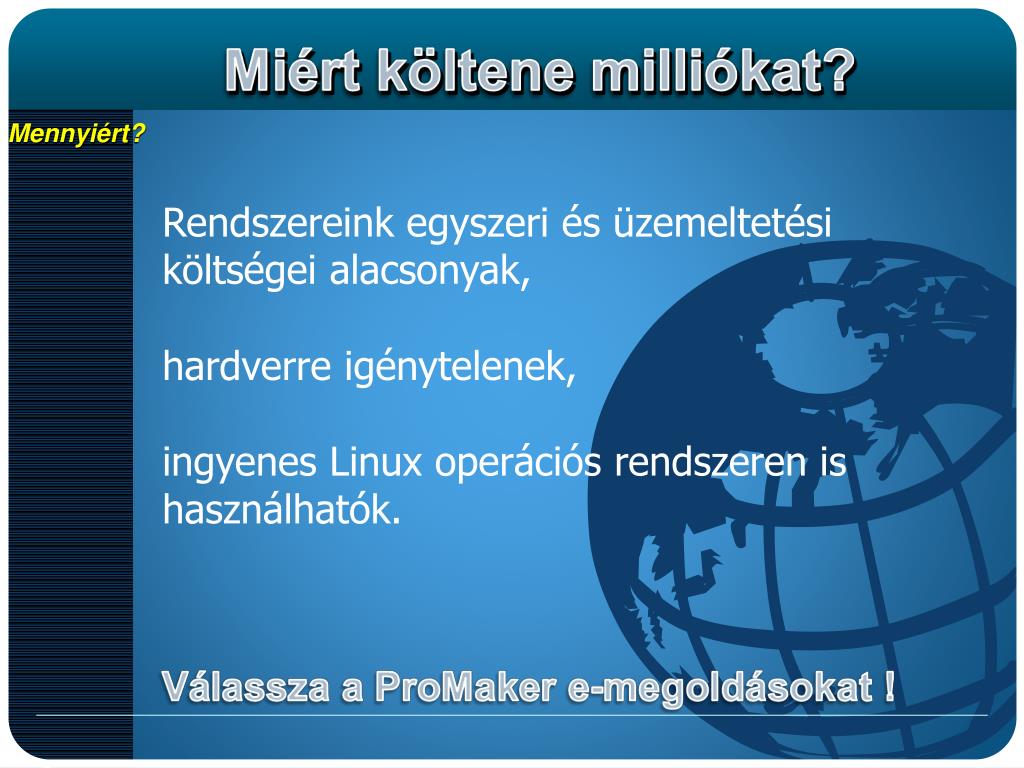 Mennyiért? Rendszereink egyszeri és üzemeltetési költségei alacsonyak, hardverre igénytelenek, ingyenes Linux operációs rendszeren is használhatók.